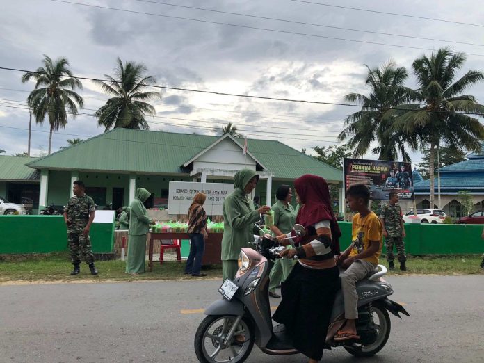 Terpantau pula puluhan anggota Koramil bersama ibu-ibu Persit turut membagikan takjil kepada masyarakat, yang dipimpin langsung oleh Danramil 1416-02/Tikep Kapten Inf Ruslan, S.E.