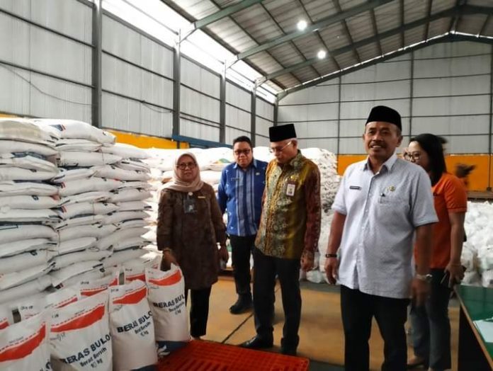 Sekda Sultra Asrun Lio saat mengecek kondisi beras di Gudang Bulog yang akan disalurkan kepada masyarakat, Kamis 6 April 2023.