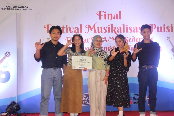 Kendari, Datasultra.com – Tim dari SMAN 1 Kendari berhasil menjadi pemenang Festival Musikalisasi Puisi Tingkat SMA/Sederajat se Sultra yang digelar oleh Kantor Bahasa Provinsi Sulawesi Tenggara (KBST) pada 12 hingga 14 Mei 2023 lalu.