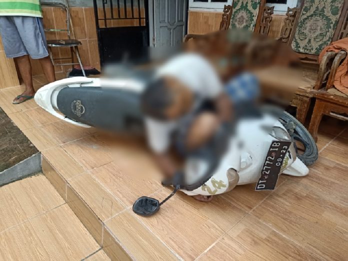 Saat ditemukan, posisi mayat berada di atas motor dengan kondisi jatuh di teras samping rumah. Diketahui, mayat tersebut bernama Baraka Renggala (59).