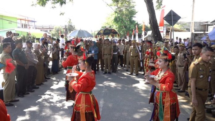Kedatangan rombongan tim penilai disambut dengan tarian selamat datang, dilanjutkan pengalungan dan penyerahan buket bunga yang diiringi dengan musik bambu. Sesampainya di kantor kelurahan, tim penilai mengikuti prosesi mombesara oleh tokoh adat setempat.