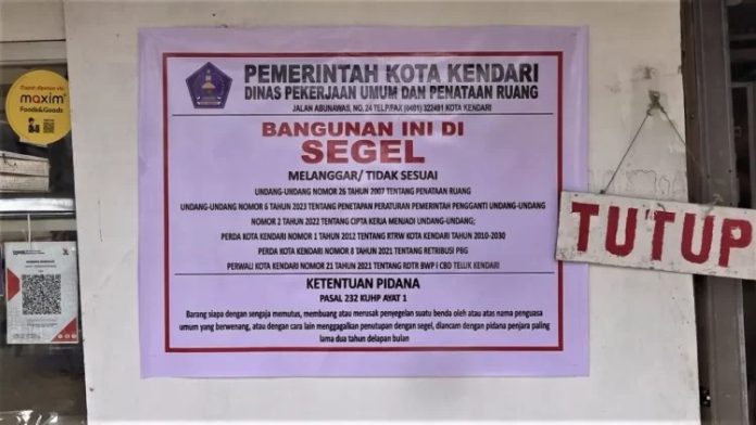 Penertiban tersebut ditandai dengan pemasangan plang penyegalan di 39 kios karena melanggar Undang-Undang Nomor 26 Tahun 2007 tentang Penataan Ruang serta lima peraturan lainnya termasuk Peraturan Wali (Perwali) Kota Kendari Nomor 21 Tahun 2021 Tentang Rencana Detail Tentang Tata Ruang (RDTR).
