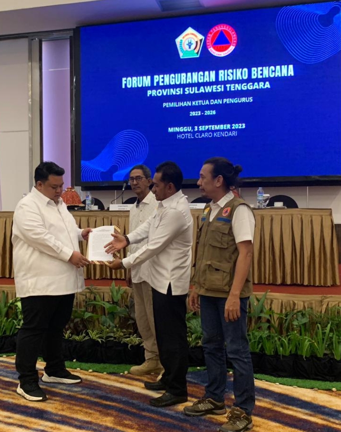 Yudhi terpilih secara aklamasi dalam kegiatan kongres II pembentukan Forum Pengurangan Risiko Bencana periode 2023-2026 di salah satu Hotel Kendari, Minggu 3 September 2023.