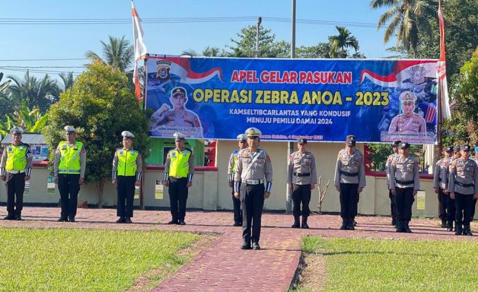Konsel, Datasultra.com – Kepolisian Resor (Polres) Konawe Selatan (Konsel) apel gelar pasukan Operasi Zebra Anoa 2023 di Lapangan Apel Polres Konsel, Senin, 4 September 2023.