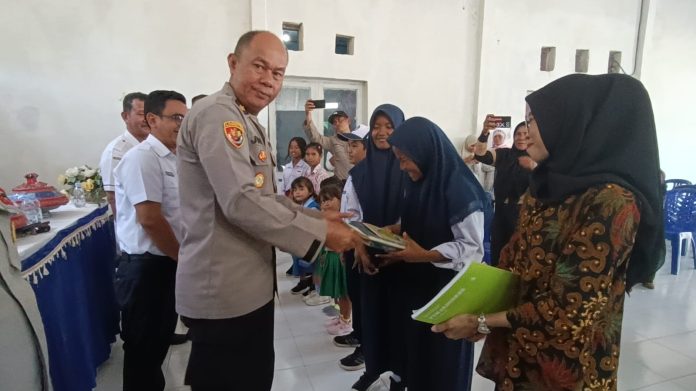Khusus di wilayah hukum Polres Baubau, pembagian buku pada hari ketiga ini (Rabu 6 September 2023) menyasar TK, SD dan SMP di Kelurahan Palabusa Kota Baubau.
