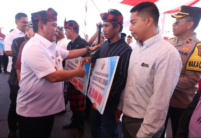 Wakatobi, Datasultra.com- Pj Gubernur Sulawesi Tenggara (Sultra), Andap Budhi Revianto melakukan penyerahan dana hibah Masjid dan Bansos berupa Sembako, penyaluran beasiswa pendidikan dan juga menggelar pasar murah di Kabupaten Wakatobi, Sabtu 4 November 2023.