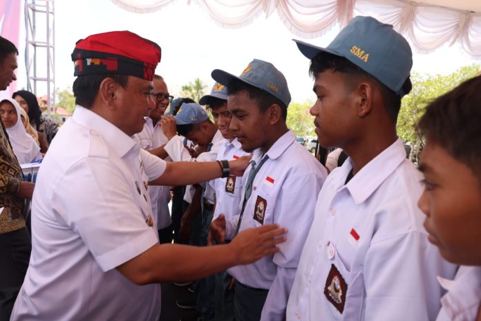 Laworo, Datasultra.com- Pj Gubernur Sultra, Andap Budhi Revianto menyerahkan Bansos berupa 2 ribu paket Sembako gratis kepada masyarakat dan bantuan beasiswa kepada siswa-siswi tingkat SMA/SMK/SLB, di lapangan Desa Guali Kecamatan Kusambi Kabupaten Muna Barat (Mubar), Minggu 5 November 2023.