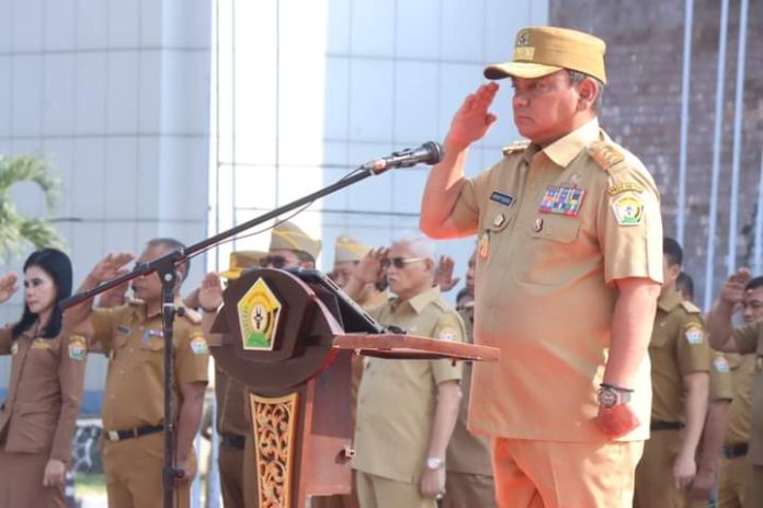 Pj Gubernur Sultra, Andap Budhi Revianto kembali memimpin apel gabungan ASN Lingkup Pemprov Sultra yang dipusatkan di Halaman Kantor Gubernur Sultra, Senin 6 November 2023.