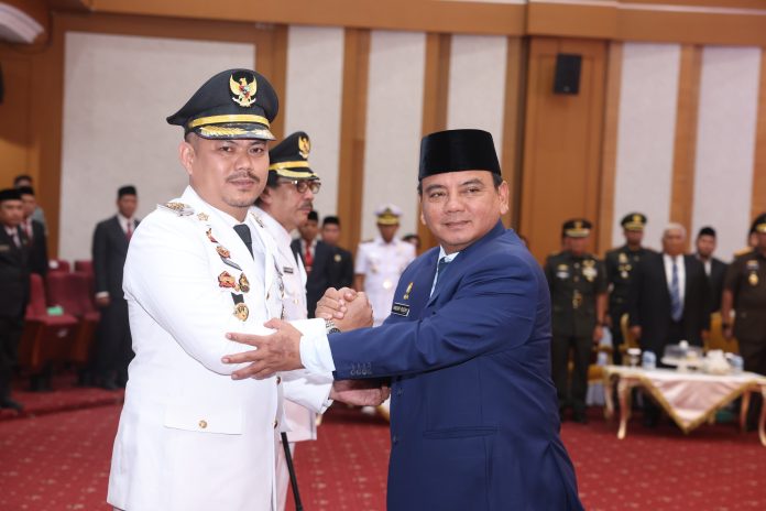 Kendari, Datasultra.com- Pj Gubernur Sulawesi Tenggara (Sultra), Andap Budhi Revianto melantik Bupati Kolaka Timur (Koltim) Abdul Azis, dan Pj Bupati Bombana Edy Suharmanto di Ruang Pola Kantor Gubernur Sultra, Senin 27 November 2023.
