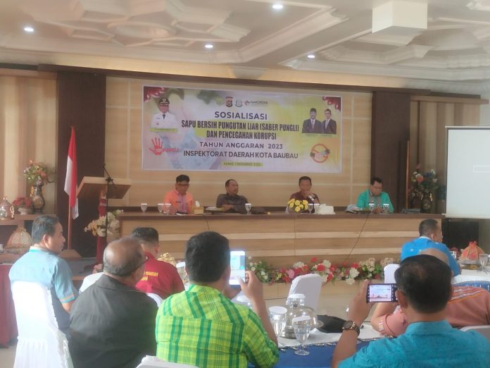 Baubau, Datasultra.com- Inspektorat Kota Baubau menggelar sosialisasi Sapu Bersih Pungutan Liar (Saber Pungli) di Hotel Mira Baubau, Kamis 7 Desember 2023.