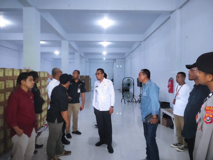 Baubau, Datasultra.com- Pj Wali Kota Baubau, Rasman Manafi meninjau logistik Pemilu 2024 di Gudang KPU Baubau, Rabu 27 Desember 2023.
