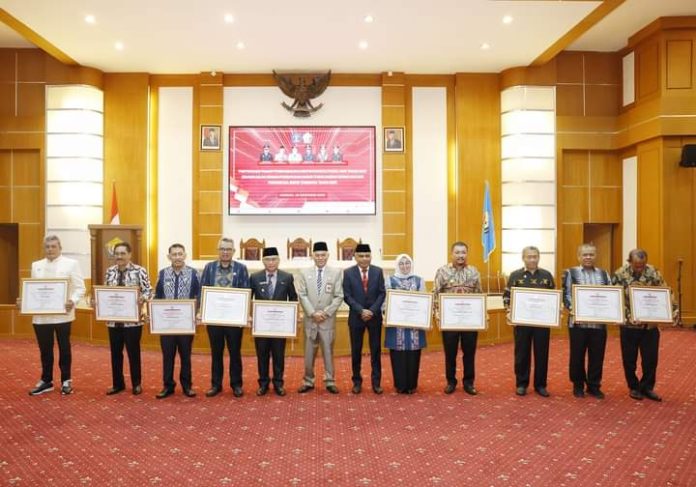 Sekda Sultra, Asrun Lio menyerahkan piagam penghargaan kabupaten kota peduli HAM serta dirangkaikan dengan pengukuhan gugus tugas daerah bisnis dan HAM Provinsi Sultra di Ruang Pola Kantor Gubernur Sultra, Kamis 28 Desember 2023.