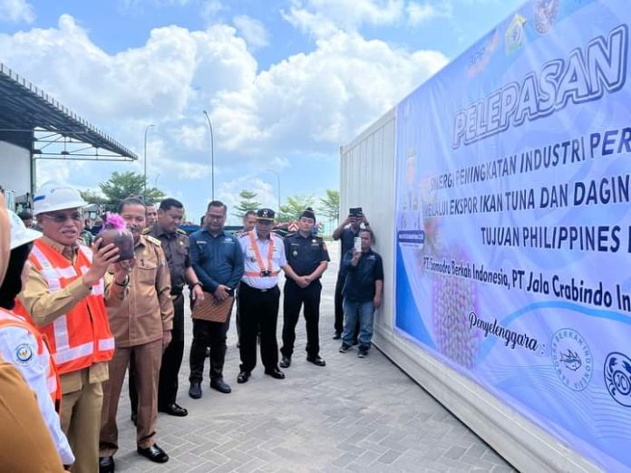 Pj Gubernur Andap Budhi Revianto melalui Sekda Sultra, Asrun Lio melepas ekspor komoditi hasil produk perikanan, dengan tujuan Negara Filipina dan Amerika Serikat di Pelindo Kendari, Selasa 20 Februari 2024.