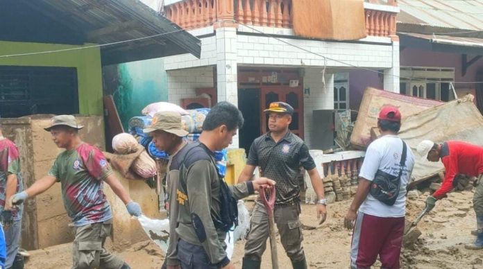 Satpol-PP melibatkan 75 personel membantu warga Kampung Salo untuk membersihan sampah dan lumpur dipimpin langsung Plt. Kasat Pol PP Sulkurnia.