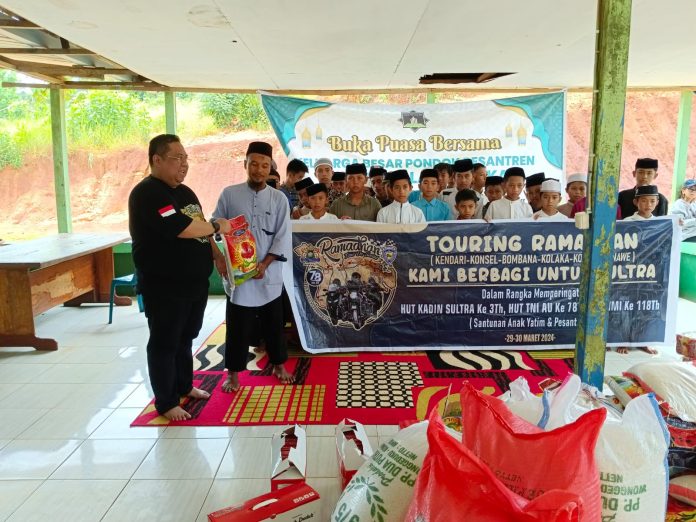 Kendari, Datasultra.com – Kegiatan touring Ramadan yang di inisiasi Kamar Dagang dan Industri (Kadin) Sulawesi Tenggara (Sultra), Ikatan Motor Indonesia (IMI) Sultra, dan Pangkalan TNI Angkatan Udara (Lanud) Haluoleo menyerahkan bantuan ke pondok pesantren dan panti asuhan.
