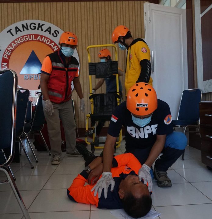 Simulasi penyelamatan korban bencana gempa bumi di kantor BPBD Sultra, Jumat 26 April 2024. (Foto : Rk/Datasultra.com)
