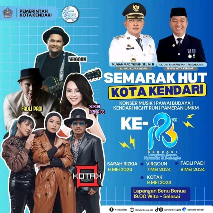 Kemudian, Band Fadli atau Padi akan tampil pada 8 Mei 2024, dan puncak HUT kota Kendari akan dihibur oleh band Kotak, pada 9 Mei 2024.