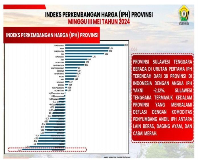 Kendari, Datasultra.com – Indeks Perkembangan Harga (IPH) di Sulawesi Tenggara (Sultra) menjadi terendah secara nasional selama dua minggu berturut-turut. Hal tersebut disampaikan dalam Rapat Koordinasi Pengendalian Inflasi secara hybrid, Senin 20 Mei 2024.