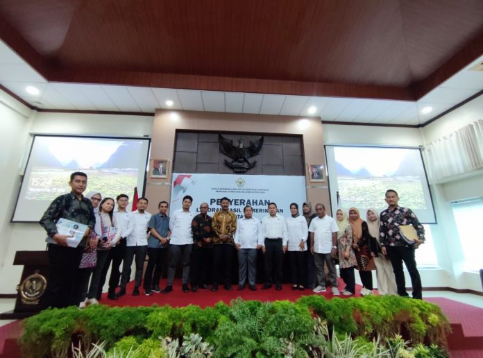 Kepala BPK RI perwakilan Sultra, Dadek Nandemar menyerahkan langsung LHP BPK kepada Pj Sekda Kota Baubau La Ode Fasikin mewakili Pj Wali Kota Baubau Rasman Manafi di Kantor BPK RI Perwakilan Sultra, Rabu 22 Mei 2024.