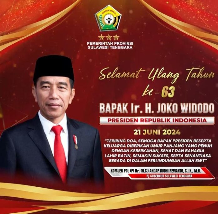 “Dihari yang berbahagia dan penuh dengan makna ini, saya Pj Gubernur Sultra atas nama seluruh jajaran Pemprov Sultra mengucapkan selamat ulang tahun ke-63 Presiden Jokowi,” ucap Andap.