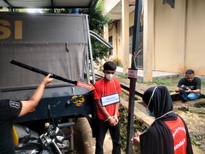 Rekontruksi kasus mantu bunuh mertua digelar di samping Mapolresta Kendari, Kelurahan Wundudopi, Kecamatan Baruga, Kamis 4 Juli 2024.