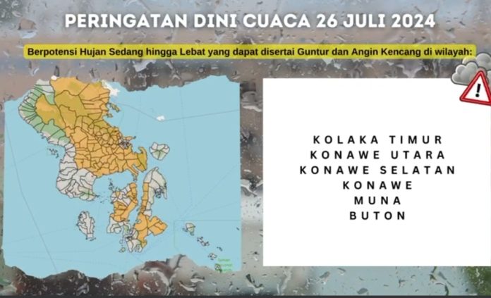 Mulai dari informasi cuaca, tanggal 26 Juli 2024, berpotensi hujan sedang hingga lebat yang dapat disertai guntur dan angin kencang di wilayah Kolaka Timur, Konawe Utara, Konawe Selatan, Konawe, Muna, dan Buton.