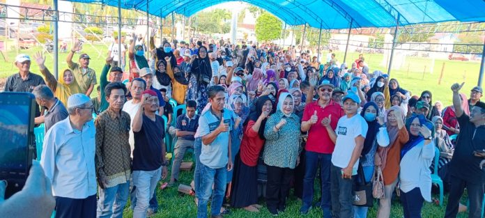 Dalam kesempatan tersebut, Tina Nur Alam bersilaturahmi dengan masyarakat dan disambut hangat oleh masyarakat yang rebutan dan berjabat tangan.