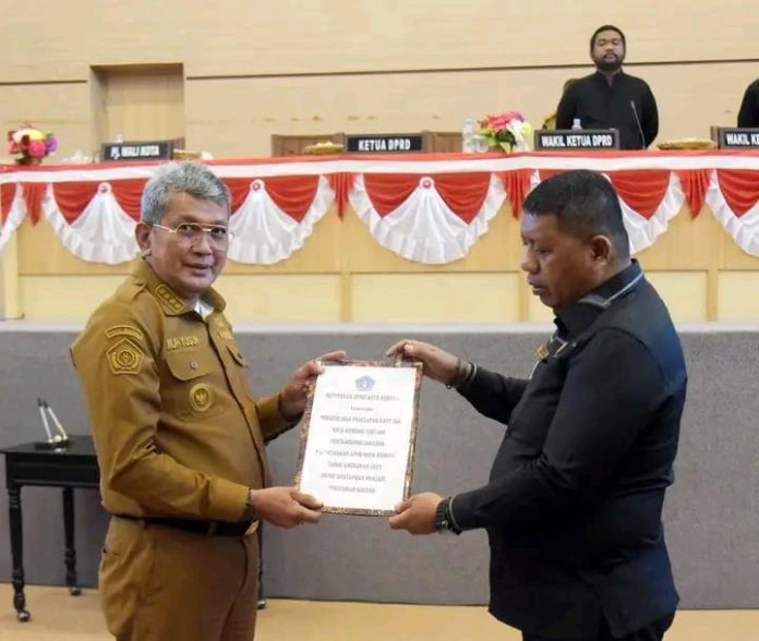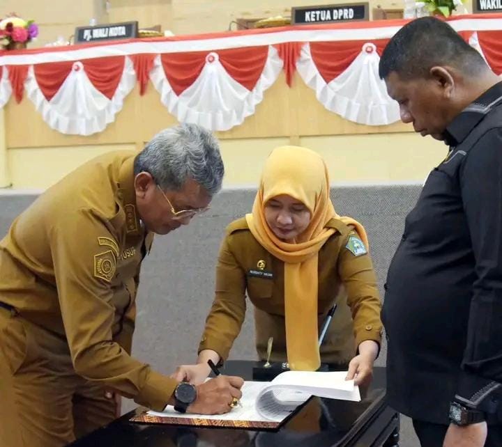 Diakhir acara, Pj Wali Kota Kendari Muhammad Yusup bersama Ketua DPRD Subhan menandatangani berita acara persetujuan bersama. Kemudian Subhan menyerahkan keputusan DPRD dan diterima oleh Pj Wali Kota Kendari. (Adv).