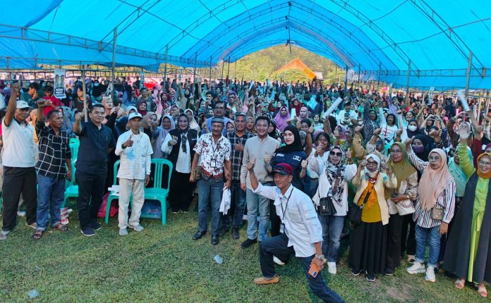Teranyar, Tina Nur Alam disambut meriah oleh ribuan masyarakat Amoito Kabupaten Konawe Selatan (Konsel) dengan menggaungkan Tina Nur Alam Gubernur Perempuan Sultra saat acara pamitan yang tertunda di lapangan Amoito, Minggu 11 Agustus 2024.