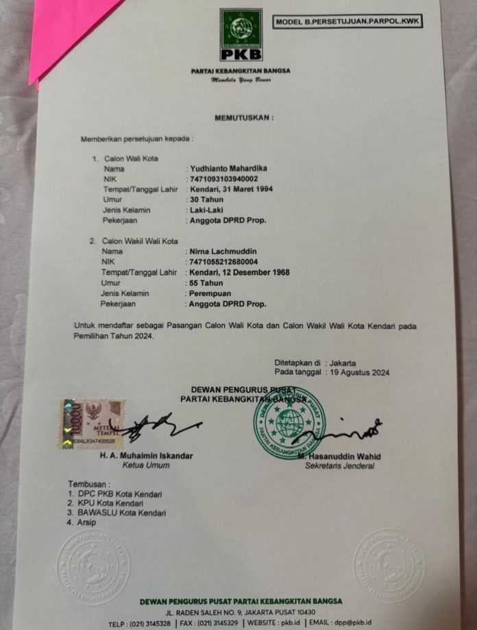 Kendari, Datasultra.com – Setelah mendapatkan rekomendasi dari PDI-P dan Gerindra, pasangan calon (paslon) Yudhianto Mahardika Anton Timbang-Hj Nirna Lachmuddin kembali menerima rekomendasi dari PKB untuk bertarung di Pemilihan Wali Kota (Pilwalkot) Kendari pada 27 November 2024 mendatang.