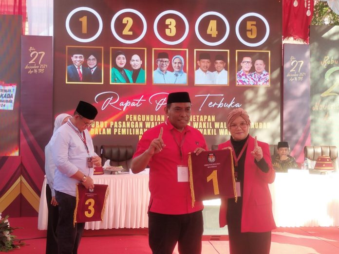 Baubau, Datasultra.com- Pasangan calon (Paslon) Wali Kota dan Wakil Wali Kota Baubau, La Ode Ahmad Monianse dan Ida Fitri Halili berhasil mendapatkan nomor urut 1 dalam pengundian nomor urut yang diselenggarakan di Kantor KPU Baubau, Senin 23 September 2024.