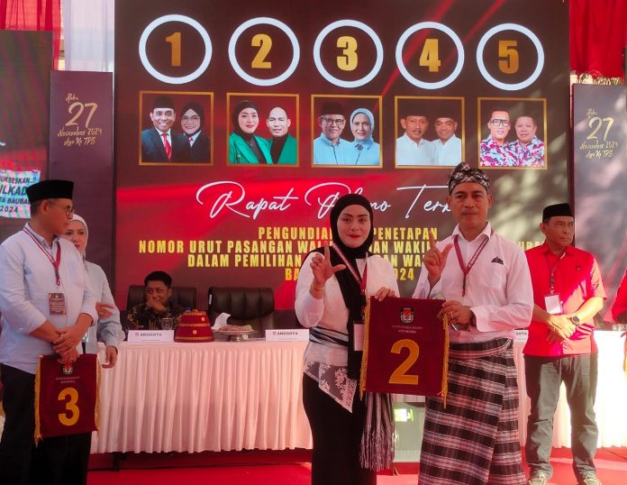 Baubau, Datasultra.com- Pasangan calon Wali Kota dan Wakil Wali Kota Baubau, Yulia Rahman dan Muhammad Ridwan yang dikenal dengan jargon KAMALI resmi mendapat nomor urut 2 dalam pengundian nomor urut yang diselenggarakan oleh KPU Baubau, Senin 23 September 2024.
