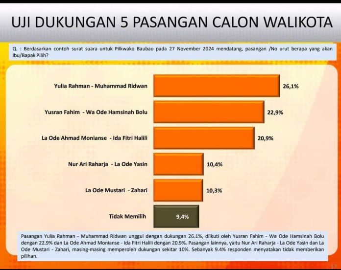 Baubau, Datasultra.com – Hasil survei terbaru yang dilakukan oleh Media Track dan Strategi mengungkapkan bahwa pasangan nomor urut 2 Yulia Rahman – Muhammad Ridwan saat ini memimpin dalam tingkat dukungan calon Wali Kota dan Wakil Wali Kota Baubau dengan perolehan 26,1 persen.