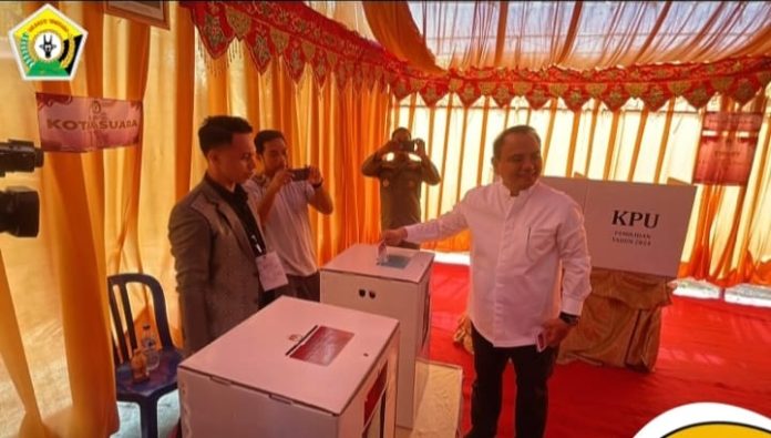 Kendari, Datasultra.com- Penjabat (Pj) Gubernur Sulawesi Tenggara (Sultra), Andap Budhi Revianto memberikan contoh teladan dengan menggunakan hak pilihnya di Tempat Pemungutan Suara (TPS) 17, Kecamatan Mandonga, Kota Kendari, Rabu 27 November 2024.
