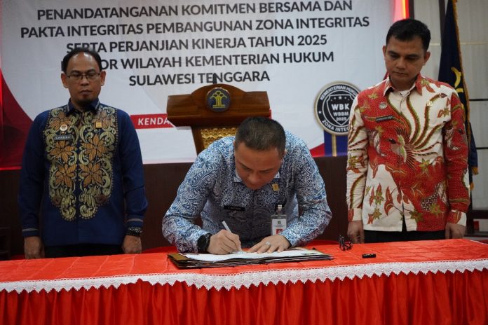 Hal ini ditandai dengan penandatanganan komitmen bersama pembangunan zona integritas, pakta integritas, dan perjanjian kinerja tahun 2025 di Aula Kanwil Kemenkum Sultra, Kamis 16 Januari 2025.