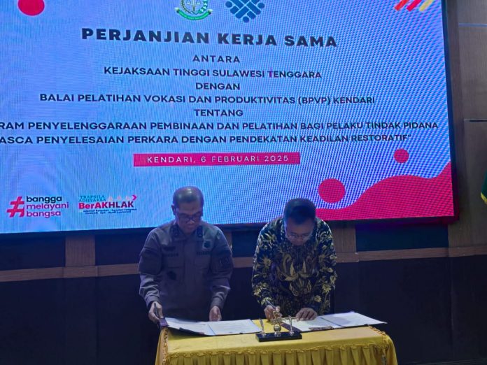 Kendari, Datasultra.com – Kejaksaan Tinggi (Kejati) Sulawesi Tenggara (Sultra) dan Balai Pelatihan Vokasi dan Produktivitas (BPVP) Sultra resmi menandatangani nota kesepakatan kerja sama dalam penyelenggaraan program pembinaan dan pelatihan bagi pelaku tindak pidana pasca penyelesaian perkara.