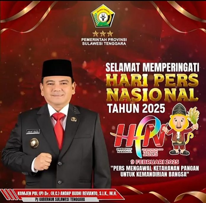 Kendari, Datasultra.com- Dalam rangka memperingati Hari Pers Nasional (HPN) ke-79 tahun 2025, Penjabat (Pj) Gubernur Sulawesi Tenggara (Sultra), Andap Budhi Revianto, menyampaikan pesan pentingnya peran pers dalam menghadapi tantangan era digitalisasi dan keterbukaan informasi.