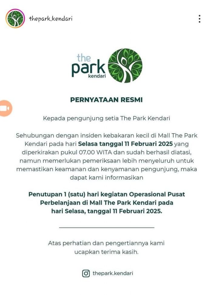 Dalam pernyataan resminya, manajemen The Park Kendari menyatakan, “Kepada pengunjung setia The Park Kendari, sehubungan dengan insiden kebakaran kecil yang terjadi pada hari Selasa 11 Februari 2025, sekitar pukul 07.00 Wita yang telah berhasil diatasi, namun memerlukan pemeriksaan lebih menyeluruh untuk memastikan keamanan dan kenyamanan pengunjung, maka kami informasikan penutupan sementara operasional mall selama satu hari pada tanggal tersebut.”
