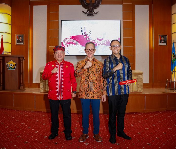 Penjabat (Pj) Gubernur Sulawesi Tenggara (Sultra), Andap Budhi Revianto, menghadiri acara pengukuhan Kepala Otoritas Jasa Keuangan (OJK) Provinsi Sultra yang baru, Bismi Maulana Nugraha, Selasa 18 Februari 2025.