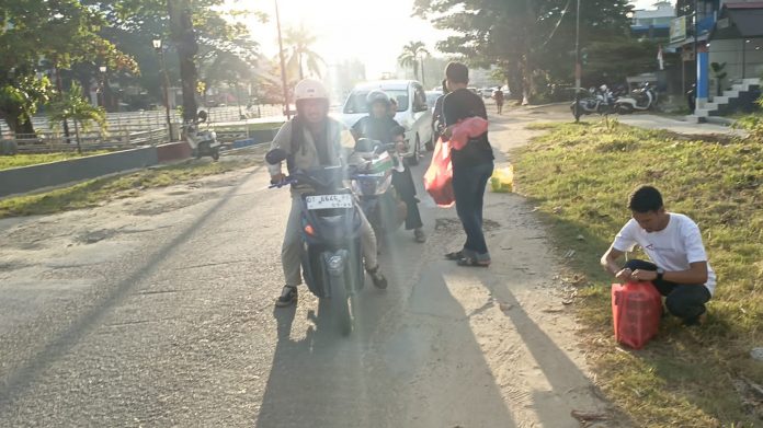 Takjil dibagikan kepada pengendara menjelang berbuka puasa. Lokasinya dibilangan Kali Kadia, Kelurahan Bende, Kecamatan Kadia, Kota Kendari, Sulawesi Tenggara, Kamis, 22 Maret 2025 sore.