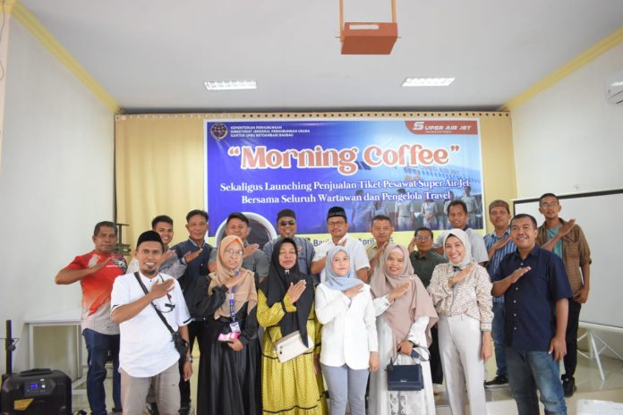 Kantor Unit Penyelenggara Bandar Udara (UPBU) Betoambari Baubau resmi meluncurkan penjualan tiket pesawat Super Air Jet Airbus A320 dalam acara “morning coffee” bersama insan pers dan pelaku usaha travel, Sabtu 5 April 2025.
