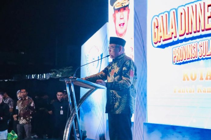 Wali Kota Baubau, H. Yusran Fahim, SE, memaparkan capaian program 100 hari kerjanya dalam sambutan Gala Dinner Musrenbang Sultra yang digelar di Pantai Kamali, Minggu malam 13 April 2025.