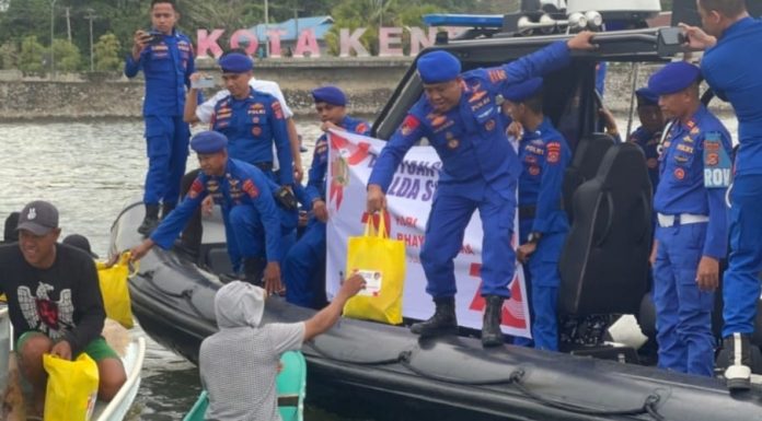 Penyerahan bansos dipimpin langsung oleh Direktur Polairud Polda Sultra, Kombes Pol Saminata dan dilaksanakan menggunakan kapal Sea Raider-2015.