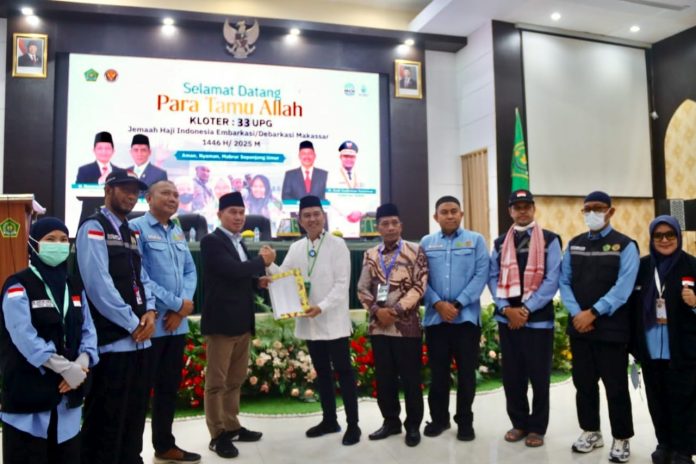 Kakanwil Sultra, Muhammad Saleh jamaah haji di Aula Penerimaan Debarkasi Asrama Haji Sudiang Makassar, Sabtu (5/7/2025).