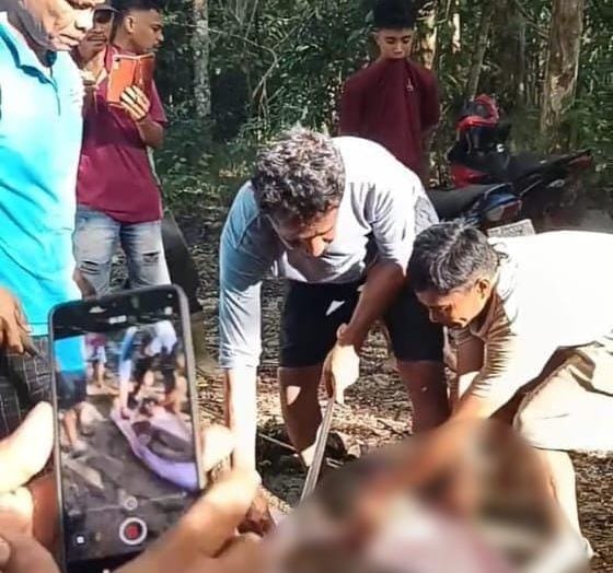 Setelah sampai di kebun, warga curiga dengan penemuan seekor ular piton sepanjang 8 meter yang tergeletak di semak-semak tidak jauh dari kandang hewan milik korban.
