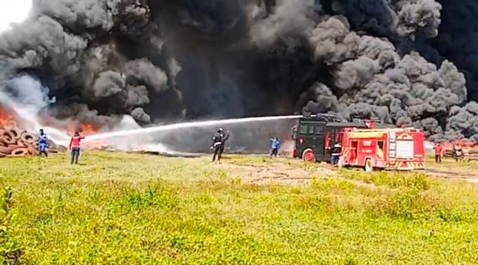 Konawe Selatan, Datasultra.com – Kebakaran hebat melanda pabrik pengolahan ban bekas PT Sulawesi Giat Turali. Asap hitam tebal tampak telihat membumbung tinggi disusul kobaran api.