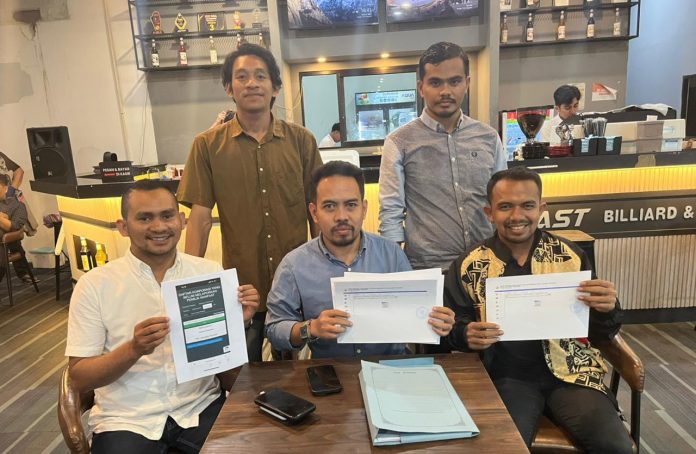 Kuasa hukum masyarakat Tapak Kuda, Abdul Razak Said Ali, SH (tengah), bersama timnya menunjukkan hasil pengecekan data Koperasi Serba Usaha Perikanan Perempangan Saonanto (Kopperson) yang tidak terdaftar dalam sistem Online Data System (ODS) Kementerian Koperasi dan UMKM, saat memberikan keterangan kepada media.