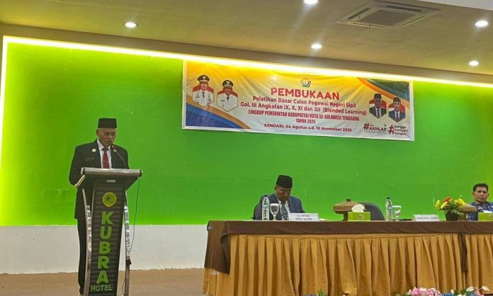 Kendari, Datasultra.com – Sekretaris Daerah Provinsi Sulawesi Tenggara, Drs. H. Asrun Lio, M.Hum., Ph.D, secara resmi membuka Pelatihan Dasar (Latsar) Calon Pegawai Negeri Sipil (CPNS) Golongan III Gelombang III Angkatan IX, X, XI, dan XII Tahun 2025 lingkup pemerintah kabupaten/kota se-Sulawesi Tenggara, di Kendari, Senin 10 November 2025.