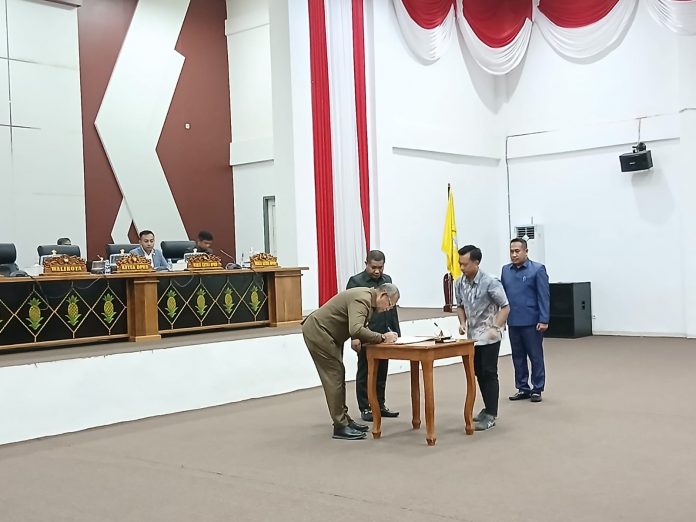 Agenda diawali pembacaan keputusan DPRD dan naskah persetujuan bersama oleh Sekretaris DPRD, Yaya Wirayahman.