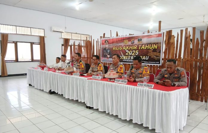 Baubau, Datasultra.com – Kapolres Baubau, AKBP Mayestika Hidayat, S.I.K., M.H., memaparkan hasil analisis dan evaluasi (anev) keamanan dan ketertiban masyarakat (kamtibmas) sepanjang tahun 2025 dalam rangka Press Release Akhir Tahun yang digelar di Aula Kemitraan Polres Baubau, Rabu 31 Desember 2025.